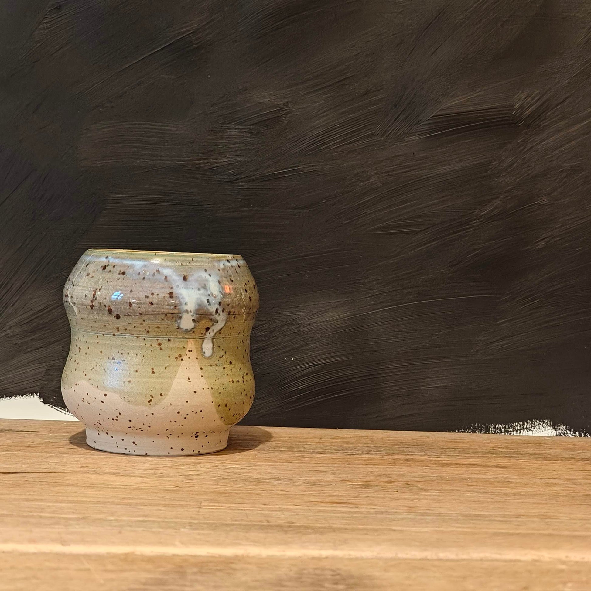Stoneware vessel, beige with spots, turquoise granite glaze.